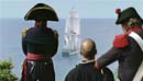 GRIEVE: And there's our wreck. MOLLO: Looking at the wreck. BENSON: So, John, why do some people wear their hats fore and aft and some people wear them side to side. MOLLO: Well, it all changed. And some older people didn't want to change their ways. Admirals and those people still wore them side to side. But everybody else started wearing them fore and aft. GRIEVE: Why did they do that, so they could swing their swords? MOLLO: It was a sort of fashion thing. It sort of came in round about the campaign in Egypt in 1801. Ahah! |
