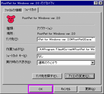 | ポストペットのショートカットを作ったはいいけど、 複数のペットでみんな一緒ではわかりにくいものです。 ここでは、ショートカットのアイコンの変え方を説明します。 なお、Windowsでは、ショートカットのアイコンは簡単に変えられますが、 プログラムやドキュメントのアイコンを変えるには 特殊な(危険な)操作が必要なので、ここでは割愛します。 |
