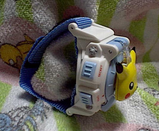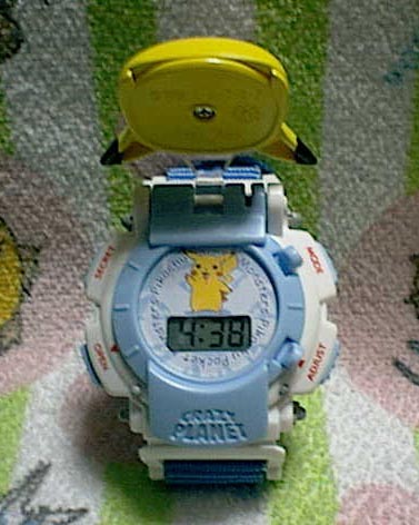 | ハローセットはひとまずお休みで、今回はスペシャルグッズの登場です。 今回はおもちゃメーカーの「バンダイ」開発のポケモンキャラウォッチ、時計です。ロッテリア商品にプラス580円を出すことでゲットできるグッズです。 早速詳細を報告します。実物を持ってみてまず一言。「でかい・・・」かなりの大きさです。で、付け心地を試そうと思ったんですけど・・・腕が太くてはまらない。リストバンドの部分の長さが足り無すぎます。下手すると子供の腕でもはまらない可能性があります。