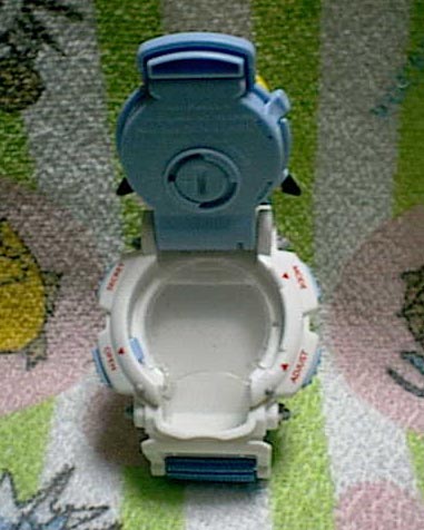 さて、この空間は奥にくぼんでいます。何に使うのか・・・と説明書を見たところ、 「お菓子の入れ方」との書き込みが。どうやらおまけで付いている「ラムネ菓子」をココに入れるみたいです・・・うーん子供を喜ばす作戦でしょうか?でもお菓子食べ終わったらこの空間はどうなってしまうんでしょう?(笑) このグッズ、結論としては「実用不向き、子供が家で遊ぶのに使うのでいっぱいいっぱい」といったところでしょうか?あくまで「玩具(おもちゃ)という意味合いで使用してね」ってことで、自分としては「時計をつけられなかったことが一番のショック」だった今回のグッズなのでした。