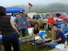 BBQ盛り上がりの図。。。 魚屋こと「ふささん」が、ホタテとハマグリを持ってきてくれた。。。メッサうまかった。。。オイラは、肉持参、みんな個々にいろんなモノを持ち寄ってワイワイガヤガヤ。。。 |