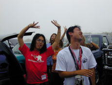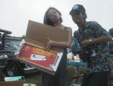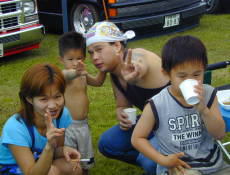 | Keitaさん。。。るん子が激写(笑)サバーのアゲモノ乗ってま〜す。 みやんとfukabee。。。まだフカさんは元気。後ろでピースしてるのフサ夫人!!!フサさん、かぶってまっせ〜〜。。。 |
