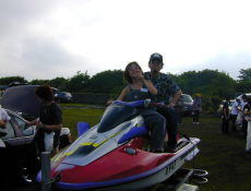 ダイナモさんが引っ張ってきたジェットスキー!るん子と二人でまたがってみた(笑)いいな〜ジェット。オイラもジェットしたいんだよね〜・・・ |