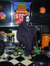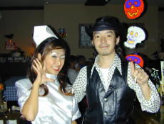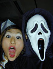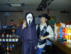 我が相棒ながら、感心します。なかなか女の子でこの顔はできないんではないかと・・・ 2人とも、この衣装は、東急ハンズで購入した。あとで、カナダに居る弟にスクリームの衣装の値段聞いたらガッカリしたけど・・・(笑)輸入品はヤッパリ値がはる・・・ |