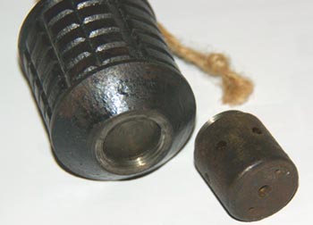 信管は遅延時間七〜八秒の遅延信管で、不用意に雷管を叩かぬように信管上部の撃針の覆いと共に安全ピンで固定されています。