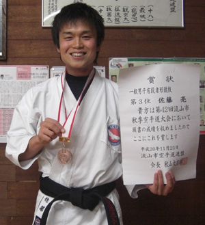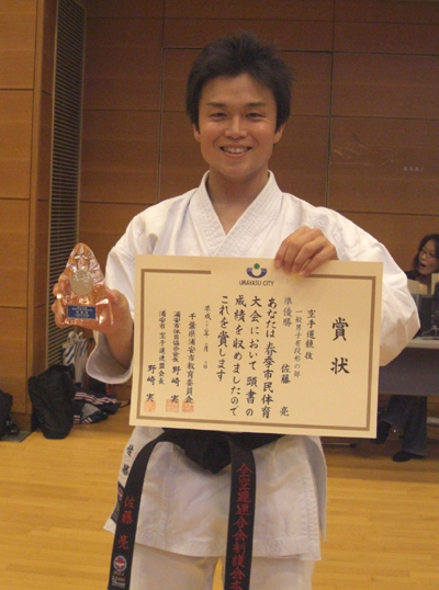 091101 浦安市立総合体育館にて開催された平成21年度浦安市民体育大会空手道競技に於いて佐藤 亮選手が一般男子有段形の部で準優勝と大活躍でした。