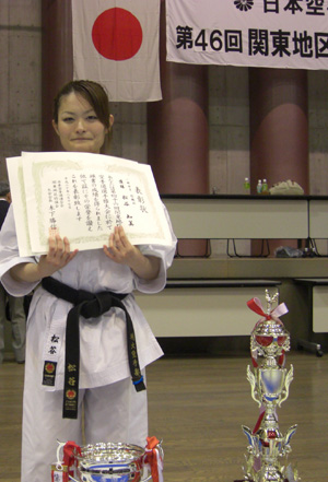 080817 東京武道館にて開催された日本空手道連合会第46回関東地区空手道選手権大会に於いて一般男子組手競技の部で優勝の青柳隼康選手!、一般女子形競技の部で優勝の松谷知美選手!、壮年男子組手の部で優勝の服部和弘選手!、小学5・6年女子組手の部で優秀選手に選ばれた今野玲華選手!、と大活躍でした。