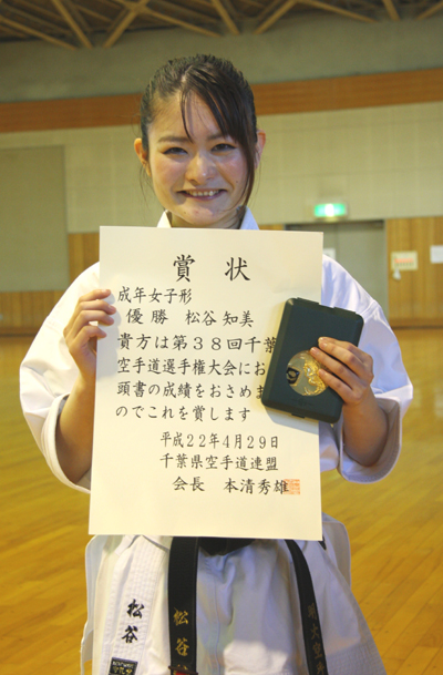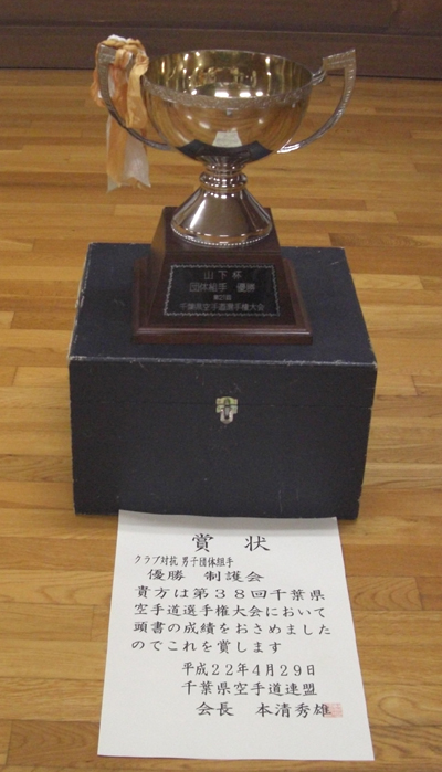 2010/0429/千葉県総合運動場内武道館にて開催されました第38回千葉県空手道選手権大会に於いて成年男子中量級組手の部で青柳隼康選手が優勝、成年女子形の部で松谷知美選手が優勝、クラブ対抗 男子団体組手の部で制護会チーム優勝と大活躍でした。