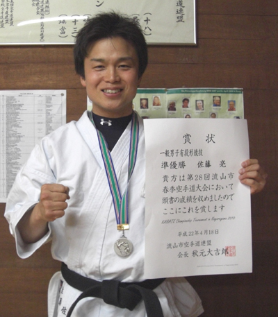 20100418 流山市総合体育館にて開催された流山市空手道大会に於いて佐藤 亮選手が一般男子有段形の部で準優勝、安田昇司選手も一般男子有段組手の部で準優勝と大活躍でした。