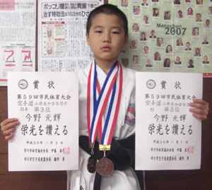 小学生高学年男子形の部第3位、組手の部敢闘賞の今野元輝選手!!