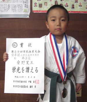 081103 国府台市民体育館にて開催された市川市民体育大会空手道競技に於いて安田昇司選手が一般男子有段組手の部で優勝、関 直人選手は一般男子有段組手の部で第3位,選手は一般男子有級組手の部、形の部とも優勝、橋本昌季選手は高校生男子組手の部で優勝、桑野恒太選手は中学2・3年形の部で優勝、組手の部も第3位、原田遼平選手も中学2・3年組手の部で第3位、今野玲華選手は小学生高学年女子組手の部で第3位、形の部でも敢闘賞、藤崎はづき選手は小学生高学年女子組手の部で敢闘賞、原田渉平選手は小学生高学年男子組手の部で準優勝、安生晴紀選手も小学生高学年男子組手の部で敢闘賞、今野元輝選手は小学生中学年男子組手の部、形の部とも第3位、今野優華選手は小学生低学年女子形の部で第3位、組手の部でも敢闘賞、桑野ェ太選手は小学生低学年男子形の部で第3位、と大活躍でした。