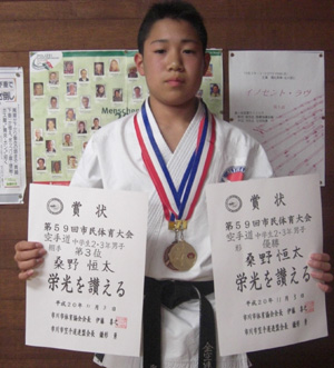 中学2・3年形の部で優勝、組手の部でも第3位の桑野恒太選手!!