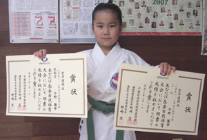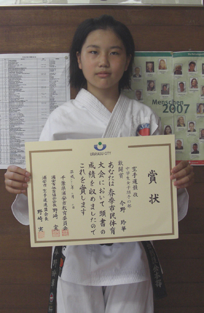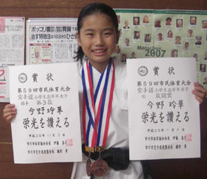 2010/0606/浦安市立総合体育館にて開催されました平成22年度浦安市民体育大会空手道競技に於いて、中学生女子組手の部で今野玲華選手が敢闘賞、小学生3・4年女子有級形の部で今野優華選手が敢闘賞と大活躍でした。