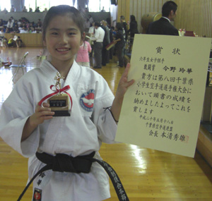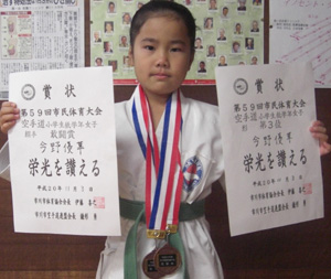 080518 千葉県総合運動場内武道館にて開催された第8回千葉県小学生空手道選手権大会に於いて6年生女子組手の部で今野玲華選手が敢闘賞と活躍しました。