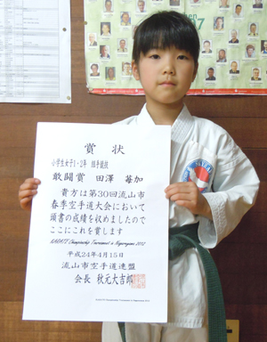 2012/0415流山市総合体育館にて開催されました第30回流山市春季空手道大会に於いて田澤苺加選手は小学生1・2年女子組手の部で敢闘賞、加藤和真選手は小学生6年男子組手の部で敢闘賞、橋本尚弥選手は中学生1年男子組手の部で第3位と大活躍でした。