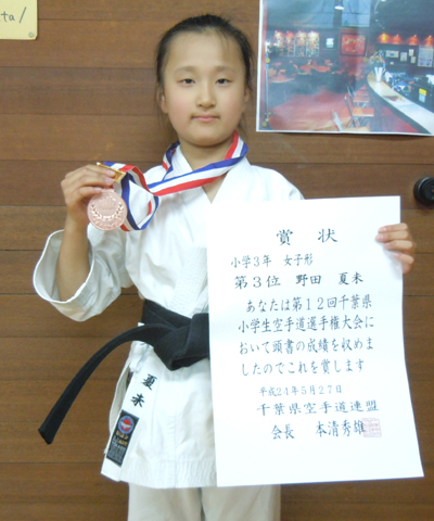 2012/0527/千葉県武道館にて開催されました第12回千葉県小学生空手道選手権大会に於いて野田夏末選手が小学3年女子形の部で第3位、桑野寛太選手が小学5年男子形の部で準優勝、尚、桑野選手は0701第1回関東少年少女空手道選手権大会千葉県代表として出場を決める大活躍でした。