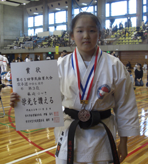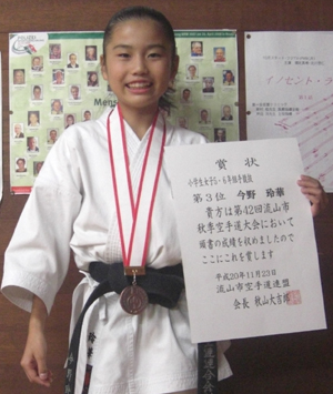 小学生高学年女子組手の部で第3位、形の部も敢闘賞の今野玲華選手!!