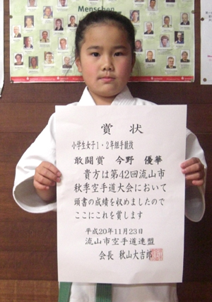 081123 流山市体育館にて開催された第42回秋季流山市空手道大会に於いて安田昇司選手が一般有段組手の部で第3位、佐藤 亮選手は一般有段形の部で第3位,橋本昌季選手は高校生男子形の部で第3位、高田蒔夫選手は高校生男子組手の部で敢闘賞、桑野恒太選手は中学生男子形の部で第3位、今野玲華選手は小学生5・6年女子組手の部で第3位、原田渉平選手は小学生6年男子組手の部で敢闘賞、今野元輝選手は小学生4年男子組手の部で第3位、今野優華選手は小学生1・2年女子組手の部で敢闘賞、と大活躍でした。