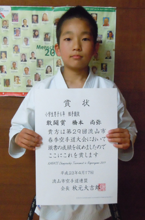 2011/0417/流山市総合体育館にて開催されました平成23年度第29回春季空手道大会に於いて、小学生6年男子組手の部でか橋本尚弥選手が敢闘賞と大活躍でした。