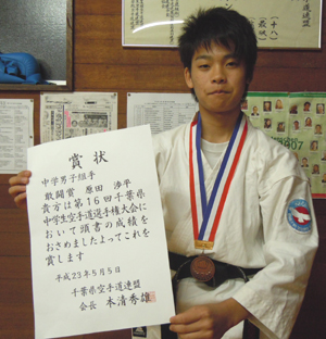 2011/0505/流山市総合体育館にて開催されました第16回千葉県中学生空手道選手権大会に於いて中学男子組手の部で原田渉平選手が敢闘賞と大活躍でした。