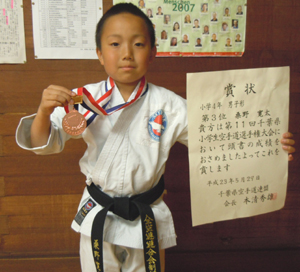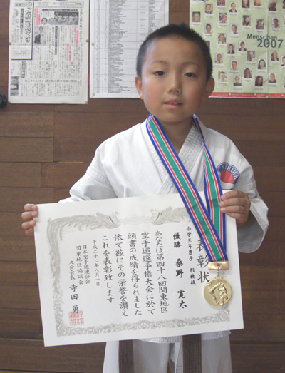 2010/0801/東京武道館にて開催されました第48回関東地区選手権大会に於いて小学生3年男子形の部で桑野寛太選手が優勝と大活躍でした。