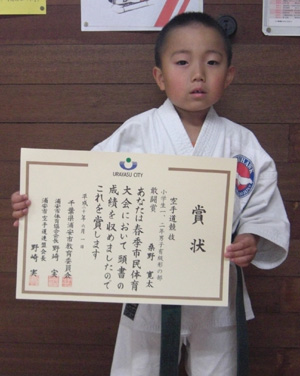 080601 浦安市立総合体育館にて開催された浦安市民体育大会空手道競技に於いて安田昇司選手が一般男子有段組手の部で準優勝、桑野恒太選手は中学生男子有段形の部で敢闘賞,桑野丈志選手は中学生2〜3年男子組手の部で第3位、別宮賢治選手は中学生男子有級形の部で敢闘賞、原田渉平選手は小学生6年男子組手の部で敢闘賞、今野玲華選手は小学生5〜6年女子組手の部で敢闘賞、桑野ェ太選手は小学生1〜2年男子有級形の部で敢闘賞、今野優華選手は小学生1〜2年女子組手の部で第3位、小学生1〜2年女子有級形の部で敢闘賞と、大活躍でした。
