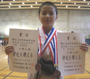 091103 国府台市民体育館にて開催された市川市民体育大会空手道競技に於いて、今野玲華選手は中学生女子組手の部で優勝、形の部でも第3位、桑野丈志選手は中学2・3年男子形の部で優勝、組手の部でも準優勝、原田渉平選手は中学1年男子組手の部で第3位、形の部でも第3位、藤崎はづき選手は小学生高学年女子組手の部、形の部共第3位、今野元輝選手は小学生高学年男子形の部で第3位、組手の部では敢闘賞、今野優華選手は小学生低学年女子組手の部で第3位、桑野ェ太選手は小学生低学年男子形の部で優勝、と大活躍でした。