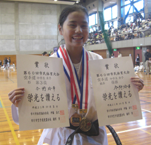 中学生女子組手の部で優勝、形の部は第3位の今野玲華選手!!