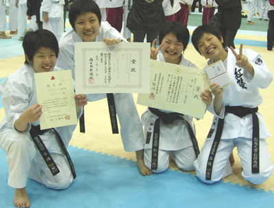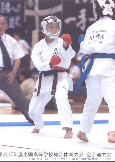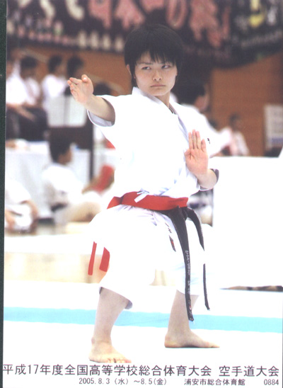 050803〜0805までの間浦安市総合体育館にて開催された平成17年度全国高等学校総合体育大会空手道大会、第32回全国高等学校空手道選手権大会に於いて兵庫県代表夙川学院高等学校3年橋本由美子選手は女子個人組手競技及び団体組手競技に於いてそれぞれ第3位、千葉県代表拓殖大学紅陵高校3年松谷知美選手は女子個人形競技に於いて第3位と両名とも優勝まで後一歩のところでしたが思う存分力を発揮いたしました。両名とも春の選抜大会に続き平成17年度空手道競技全日本高校代表選手に認定されました。今後ますますの健闘を期待いたします。