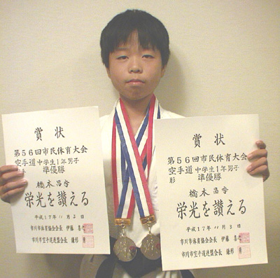 中学1年男子組手の部準優勝,形の部でも準優勝の橋本昌季選手!!