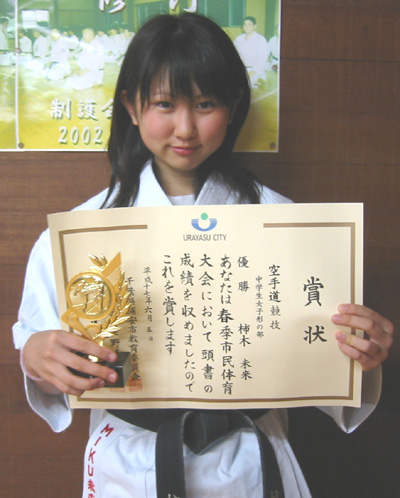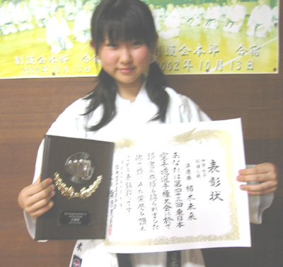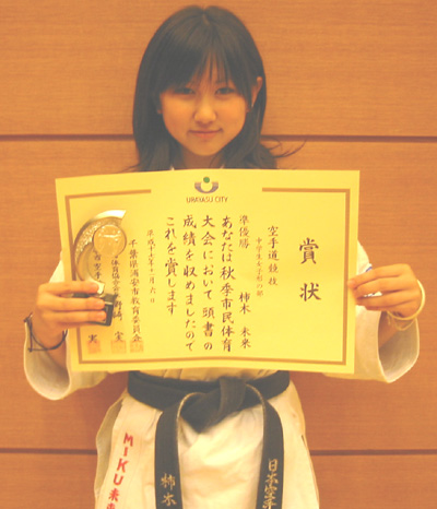 050710荒川区総合スポーツセンターにて開催された日本空手道連合会第43回東日本空手道選手権大会に於いて制護会の柿木未来選手が中学女子形の部で準優勝と大活躍!!尚、平成17年10月16日大阪府立体育館にて開催される第43回全国空手道選手権大会の出場を決めました、健闘を期待致します。