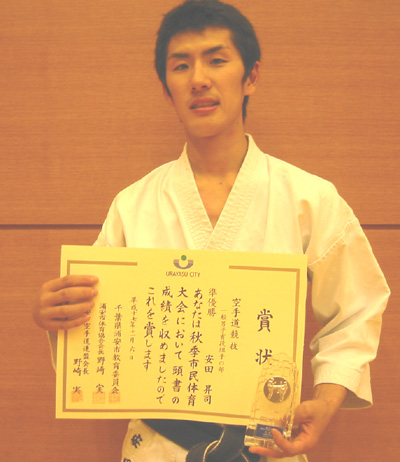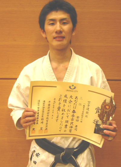 051106浦安市立総合体育館にて開催された大会で制護会大活躍!!一般男子有段組手の部で安田昇司選手が準優勝!柿木未来選手は中学生女子形の部で準優勝!中学生1年男子組手で橋本昌季選手が敢闘賞!桑野丈志選手は小学生5年男子組手の部で敢闘賞、小学生有段形の部でも敢闘賞と大活躍でした。