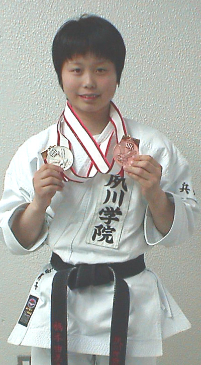 050328-0330福岡国際センターで開催された第24回全国高等学校空手道選抜大会に於いて各地区代表の制護会女性拳士大活躍!関東地区代表千葉県拓殖大学紅陵高校2年松谷知美選手は女子個人形競技において全国第3位、近畿地区代表兵庫県夙川学院高校2年橋本由美子選手は女子団体形競技で全国準優勝、女子団体組手競技で全国第3位、女子個人組手競技でベスト16とそれぞれ思う存分実力を発揮しました。両名は全国高等学校体育連盟から平成17年度全日本高校代表候補選手として松谷知美選手は形で橋本由美子選手は組手でそれぞれ強化選手として指定を受けました。おおいに期待しています!!
