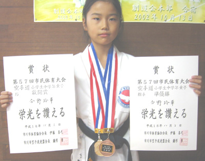 小学生中学年女子組手の部で準優勝、形の部で敢闘賞の今野玲華選手!!