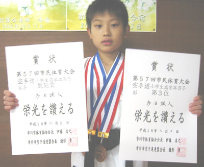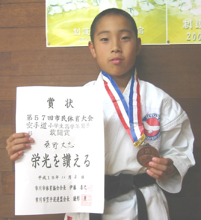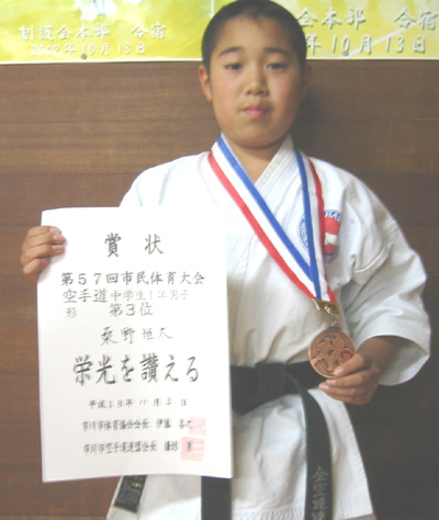 061103 市川市国府台市民体育館に於いて開催された、第57回市川市民体育大会空手道競技で制護会またまた大活躍!一般有段男子組手の部で安田昇司選手が優勝、一般女子形の部で柿木未来選手が優勝、一般女子組手の部で須藤里紗選手が第3位、一般有級男子形の部で谷島秀一選手が準優勝、高校生男子組手の部で入江和行選手が準優勝、形の部でも第3位、多田学人選手も組手の部で第3位、中学生2・3年男子組手の部で優勝、形の部でも第3位、中学生1年男子形の部で優勝、桑野恒太選手は第3位、清水新士選手も第3位、小学生高学年男子形の部で多田颯人選手が第3位、桑野丈志選手は敢闘賞、組手の部でも多田颯人選手が敢闘賞、網守晃次郎選手、中澤佳祐選手も敢闘賞、小学生中学年女子組手の部で今野玲華選手が準優勝、荒木梨沙選手は第3位、藤崎はづき選手は敢闘賞、形の部でも今野玲華選手、山田由加選手、藤崎はづき選手とも敢闘賞、小学生低学年男子組手の部で齋藤元希選手が準優勝、熊谷 淳選手は敢闘賞、形の部でも齋藤元希選手、井上慶亮選手が敢闘賞、小学生低学年女子組手の部で赤松亜沙美選手が敢闘賞と大活躍でした!!