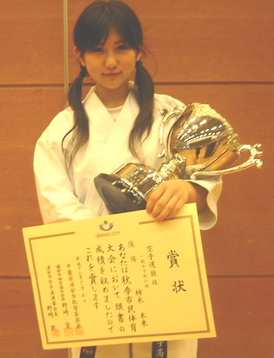 061105 浦安市立総合体育館で開催された浦安市制25周年記念大会秋季空手道競技に於いて市川大会に続き制護会大活躍!!一般女子形の部で柿木未来選手が先日の市川大会に続き優勝!!原田遼平選手が中学生1年生男子組手の部で敢闘賞、小学生4年男子組手の部で原田渉平選手が準優勝、今野玲華選手が小学生3・4年女子組手の部で第3位と大活躍でした!!