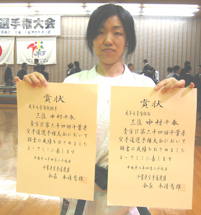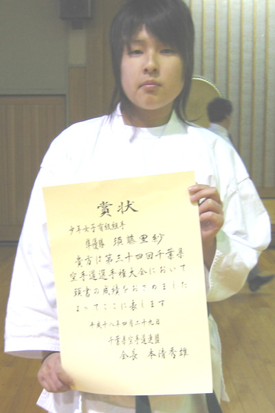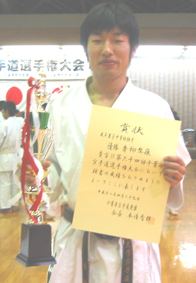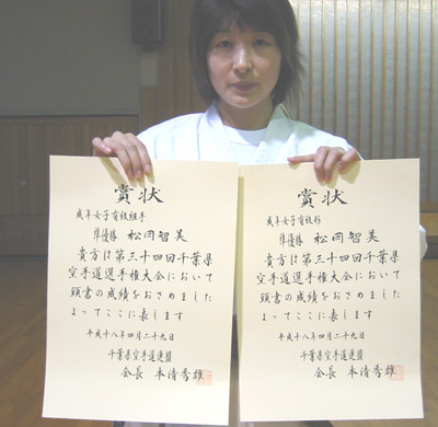 060429 千葉県総合運動場内武道館にて開催された大会で制護会大活躍!!成年男子中量級組手の部で青柳隼康選手が優勝!成年女子形の部で松谷知美選手が準優勝、関 茂人選手は少年男子有級組手の部で第3位、少年女子有級組手の部で須藤里紗選手が準優勝、松岡智美選手は成年女子有級組手の部、形の部とも準優勝、中村千春選手も形の部、組手の部とも第3位と大活躍でした。