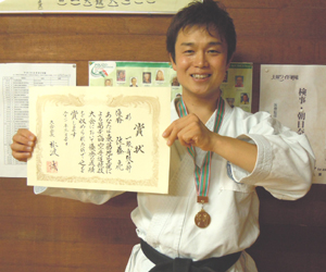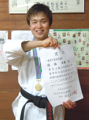 2011/0417/流山市総合体育館にて開催されました平成23年度第29回春季空手道大会に於いて一般男子有段組手の部で安田昇司選手が第3位、一般男子有段形の部で佐藤 亮選手が優勝、小学生6年男子組手の部でか橋本尚弥選手が敢闘賞と大活躍でした。