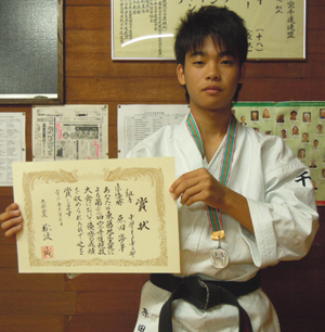 2011/0505/流山市総合体育館にて開催されました第16回千葉県中学生空手道選手権大会に於いて中学男子組手の部で原田渉平選手が敢闘賞と大活躍でした。