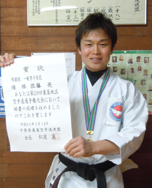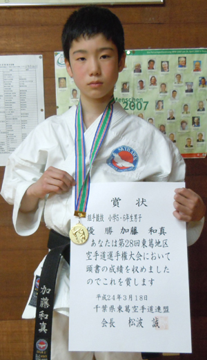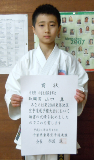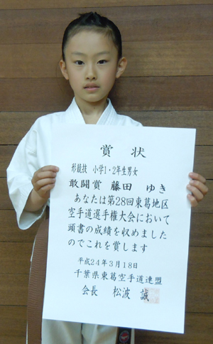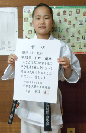 2012/0318/流山市総合体育館にて開催されました第28回東葛地区空手道選手権大会に於いて藤田ゆき選手が小学1・2年生男女形の部で敢闘賞、今野優華選手は小学3・4年生女子組手の部で敢闘賞、加藤和真選手は小学5・6年男子組手部で優勝、橋本尚弥選手は小学生有段者男女形の部で第3位、小学5・6年男子組手の部でも敢闘賞、山口 真選手も小学生有段者男女形の部で敢闘賞、今野玲華選手は中学生女子組手の部で第3位、佐藤 亮選手は一般有段形の部で優勝と大活躍でした。