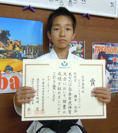 2012/0603/浦安市立総合体育館にて開催されました平成24年度浦安市民体育大会空手道競技に於いて今野玲華選手が一般女子形の部で準優勝、橋本尚弥選手、野田一樹選手が中学生1年組手の部で敢闘賞、加藤和真選手は小学生6年男子組手の部で第3位と大活躍でした。