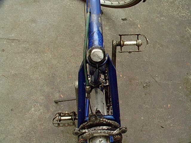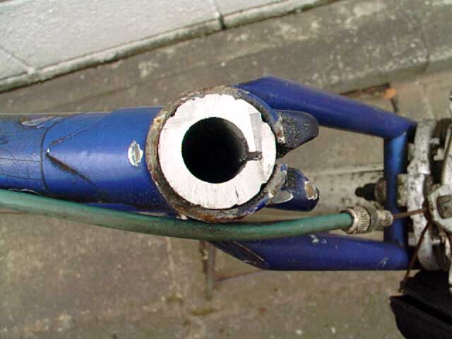 万力でだめなものがモンキーレンチで回るわけないのです、涙。 会社でドライアイスを使って分析の下準備をしていた時に漠然と頭に浮か んだのです、アルミとクロモリ鋼では熱膨張率が違うからシートピラーを ドライアイスで冷やすとどうなるのだろうかって。 まず家の近くでドライアイスを手に入れなくては、50gや100gでは 話にならないから炭酸ガス店を電話帳で探して2Kgほど買いこむ。 シートピラーの残っている部分をヤスリで削ってモンキーレンチで 回せるようにしておきドライアイスを上から載せて軽く押さえる。 ギュゥーンと変な音を立ててドライアイスがシートピラーに食い込んで行く、 昇華した炭酸ガスがドライとピラーの隙間で逃げ場を探してキリキリ舞いを しているんだ、フレームにドライが触らない様に注意しながら押さえていると 10分程でピラーにびっしり霜が着く。 さらに15分程経つとフレームのシートチューブに水滴が成長してくる。 40分目にはシートチュープに長さ15cmもの霜が着き白く輝いてくる。 フレームの霜の先端がシートピラーの先端と考えてほぼ間違い無い、 とするとやけに深くシートピラーが入っていることになる、 嫌な感じだ、やっぱりピラーを叩き込んだに違いない。 ともかく一度試しにモンキーレンチでピラーを回して様子を見る事にする、 ぐいと力を入れても・・動かない、モチロン凍り付いた訳では無い。 ハンマーで横に引っ叩いてからモンキーで回そうとしても動かない。 霜はドンドン溶けて行く、再びドライを載せて冷やしてから再挑戦するも やっぱり動かない。ウーン参った。 最終非常手段としてはピラーを金鋸の歯で分割してほじくり出す 手も有るのだが、なにかもっとこうスマートな方法が無いものだろうか。 |