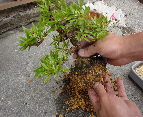 よくほぐした根の全体の三分の一をきり、木の真下にあたる部分はより深くきりつめます。